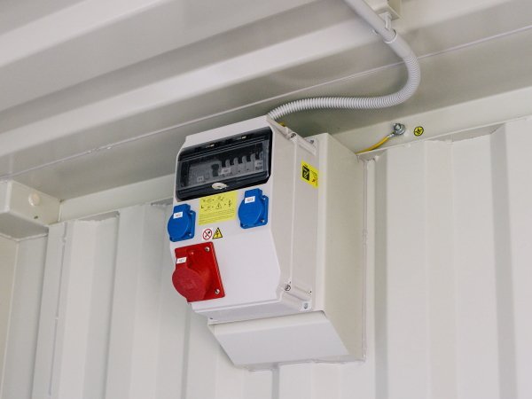 Tirez davantage profit de votre conteneur de stockage : avec l'équipement électrique approprié, une utilisation multiple est possible, comme atelier mobile par exemple. Les options d'équipements suivantes sont disponibles : Tableau électrique avec prises électriques intégrées (1 prise 400V triphasée / 16 A, 2 prises 230V monophasées / 13 A), prises CEE extérieures encastrées, électricité pour pièce humide, rampe d'éclairage LED.