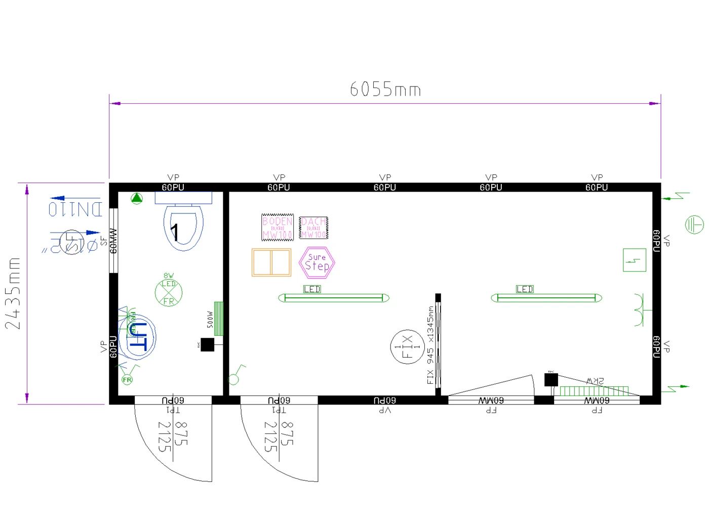 Equipement standard : 2 portes | 2 fenêtres | 1 vasistas | 3 rampes d’éclairage LED | 3 prises électriques | Chauffage convecteur électrique 500 W et 2kW