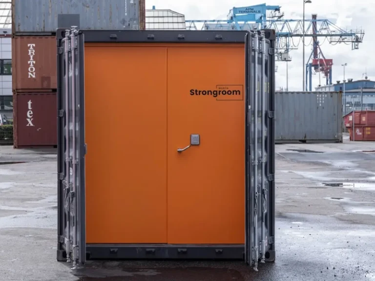 Chambre forte aménagée dans un container maritime 20 pieds Dry avec plaque de navigabilité CSC. Véritable coffre-fort mobile approuvé pour le stockage d’argent liquide, d’armes et d’explosifs. Certifié EN 1143-1 classe 3. Porte double dotée d’une serrure à code électronique.