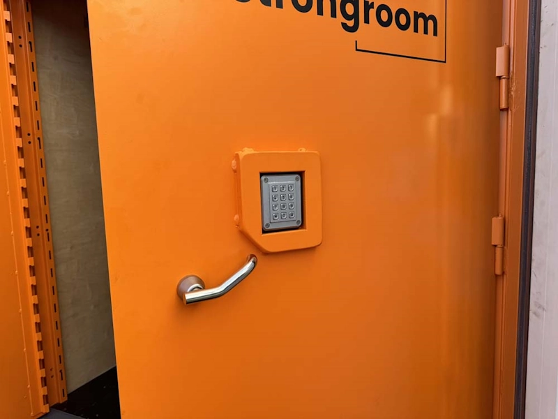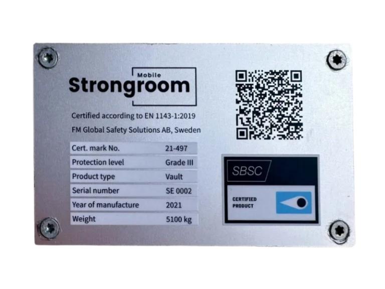 Chambre forte basée sur un conteneur maritime standard de 20 pieds, renforcé par une structure intérieure. Ce renforcement permet de répondre aux exigences de la classe 3 pour les chambres fortes, conformément à la norme européenne EN 1143-1 relative aux chambres fortes et coffres coffres-forts, tout en respectant extérieurement toutes les spécifications d’un conteneur maritime de 20 pieds.