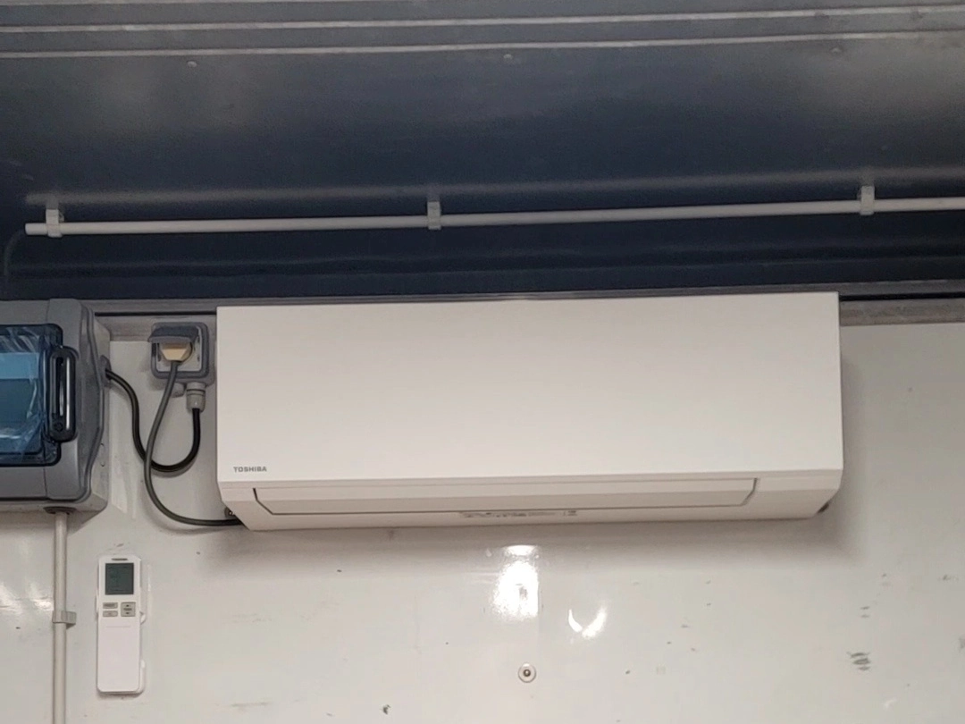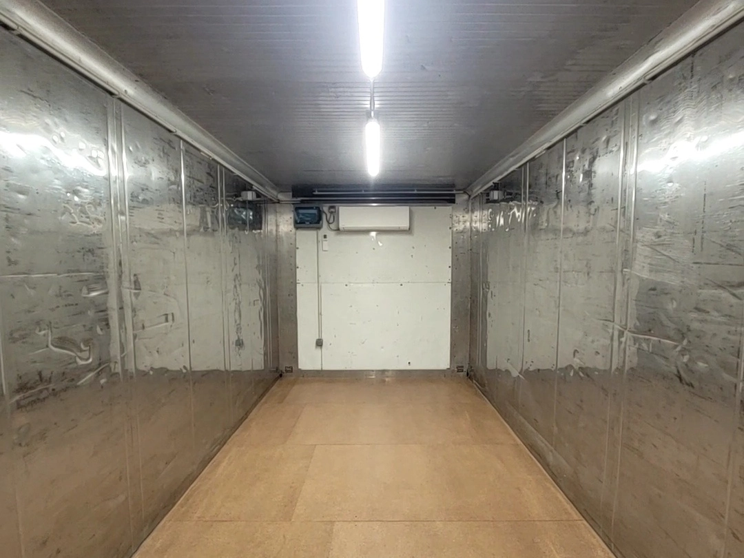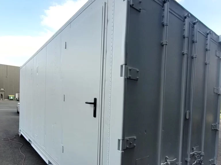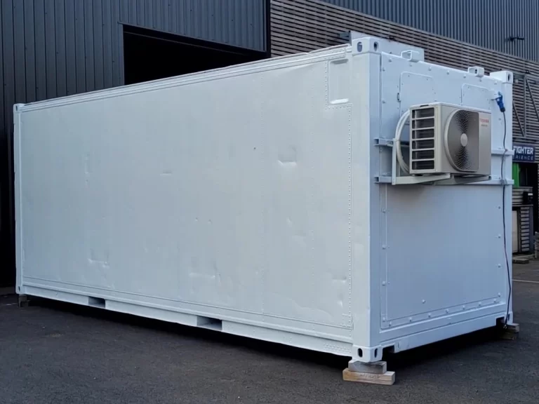 Container maritime isotherme transformé en local de stockage climatisé (14 m²/28 m3). Equipé d’une PAC réversible, de l’éclairage et de prises électriques 220V. Accès facile par une porte de service isolée. Entièrement repeint. Déshumidificateur en option.