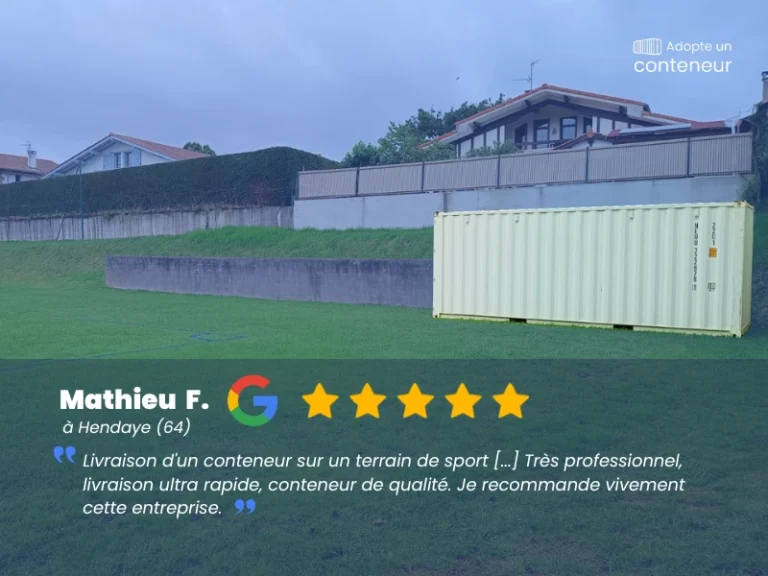 Trustindex vérifie que la source originale de l'avis est Google. Entreprise efficace et professionnelle, Yohann prend le temps en amont pour vous conseiller et vérifier la faisabilité pour la livraison. Container conforme à la commande, respect des délais ! Je vous recommande cette entreprise peladan pierre2025-07-11Trustindex vérifie que la source originale de l'avis est Google. une commande de container maritime au top un plus pour le transporteur professionnel et a l'ecoute ainsi que tout l'équipe de adopte un container, rassurante et avec un bon dialogue Christophe L2025-06-15Trustindex vérifie que la source originale de l'avis est Google. Équipe au top Julien BEAUMONT2025-05-22Trustindex vérifie que la source originale de l'avis est Google. bonjour, Adopte un conteneur au top réactivité conteneur de premier choix pas du tout une arnaque les containers de premier choix nous a était livrer pour les équiper pour le salon du Bourget cet la deuxièmes fois que nous travaillons avec vous et cet toujours un plaisir et carré sur tout les points je vous le recommande fortement a tous l'équipe de Aura Aéro vous remercie pour votre réactivité vu le délai court Julien PIBERNAT2025-05-16Trustindex vérifie que la source originale de l'avis est Google. Très bon partenaire ! Superbe collaboration avec Yohann. Tom Fournier Viewmi2025-05-14Trustindex vérifie que la source originale de l'avis est Google. Je suis très satisfait de ma commande et surtout relationnel très pro., très disponible, et très réactif. Produits très bien emballés et rapidement reçus. HERVE VASSEUR2025-05-13Trustindex vérifie que la source originale de l'avis est Google. Quand on lui laisse un message, ne rappelle jamais c’est de l’arnaque guy deletang2025-05-12Trustindex vérifie que la source originale de l'avis est Google. J’ai commandé deux containers maritimes d’occasion pour du stockage. Je suis très satisfait du service. Livraison très rapide et parfaitement exécutée. Encore merci 👍 Laurent Goutieras2025-05-10Trustindex vérifie que la source originale de l'avis est Google. Très content de ce container maritime premier voyage. L'équipe d'adopte un conteneur a réalisé la mise en peinture pour correspondre à nos attente et cela dans un délai très correct. La livraison était très professionnelle, le chauffeur maitrisait bien sa grue et les consignes de sécurité associées Rémi Aragon2025-04-23Trustindex vérifie que la source originale de l'avis est Google. Société réactive et conteneur de qualité. Le matériel a été livré rapidement après notre paiement. Nous recommandons les services de Yohann et son équipe. Osertech SARL2025-04-16Certifié par: TrustindexLe badge vérifié de Trustindex est le symbole universel de confiance. Seules les meilleures entreprises peuvent obtenir le badge vérifié, avec une note supérieure à 4.5, basée sur les avis des clients au cours des derniers 12 mois. En savoir plus