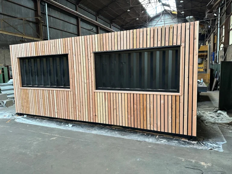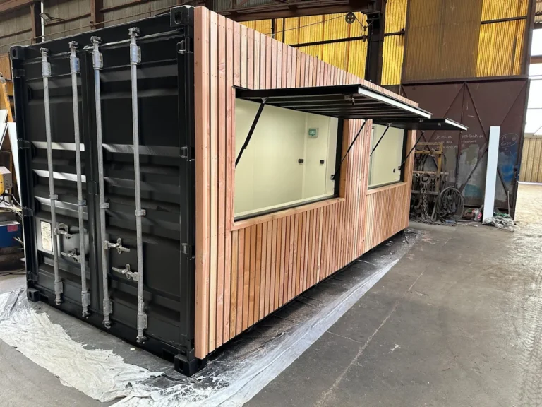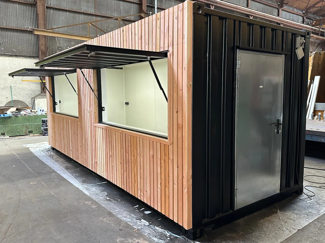 Container maritime aménagé en snack ou bar. Doublage isolant murs et plafond et sol aux normes d’hygiène. Electricité et éclairage. Arrivée d’eau. Tablettes rabattables. Bardage bois Douglas à claire-voie.