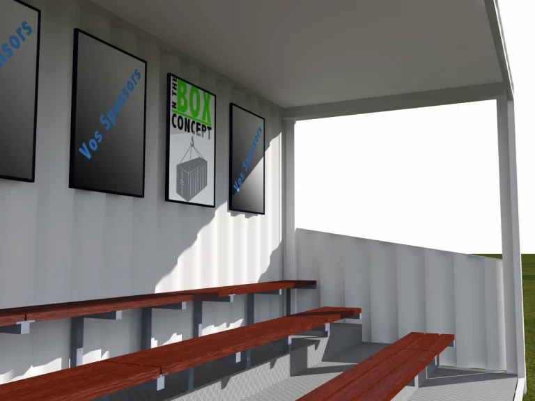 Tribune offrant une belle vue aux spectateur sur le terrain ou pour des événements. Facilement déplaçable en grutage avec les coins iso du container ou avec engin muni de fourches (container muni de passages de fourches).